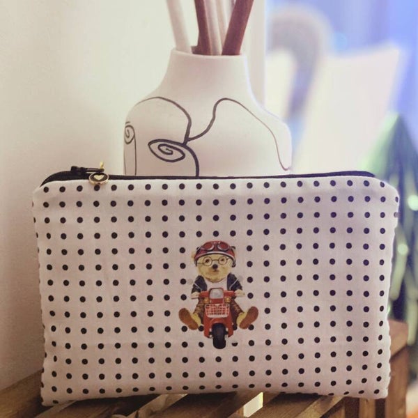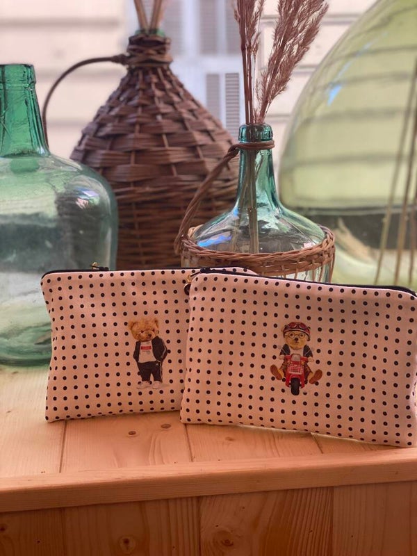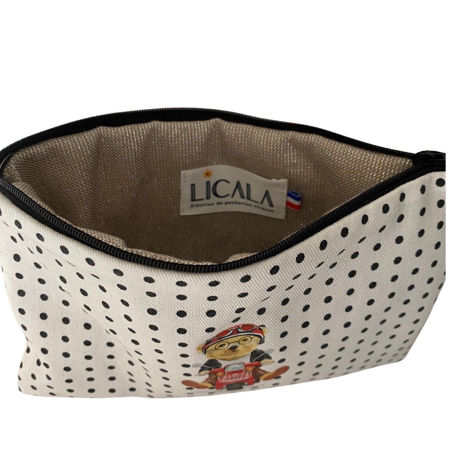Pochette plate en tissu de coton imprimé à pois noirs à transporter partout avec soi.